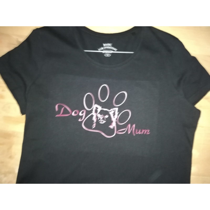 Damen-Shirt mit dem Aufdruck "Dogs Mum" und verschiedenen Hunderassen in der Pfote